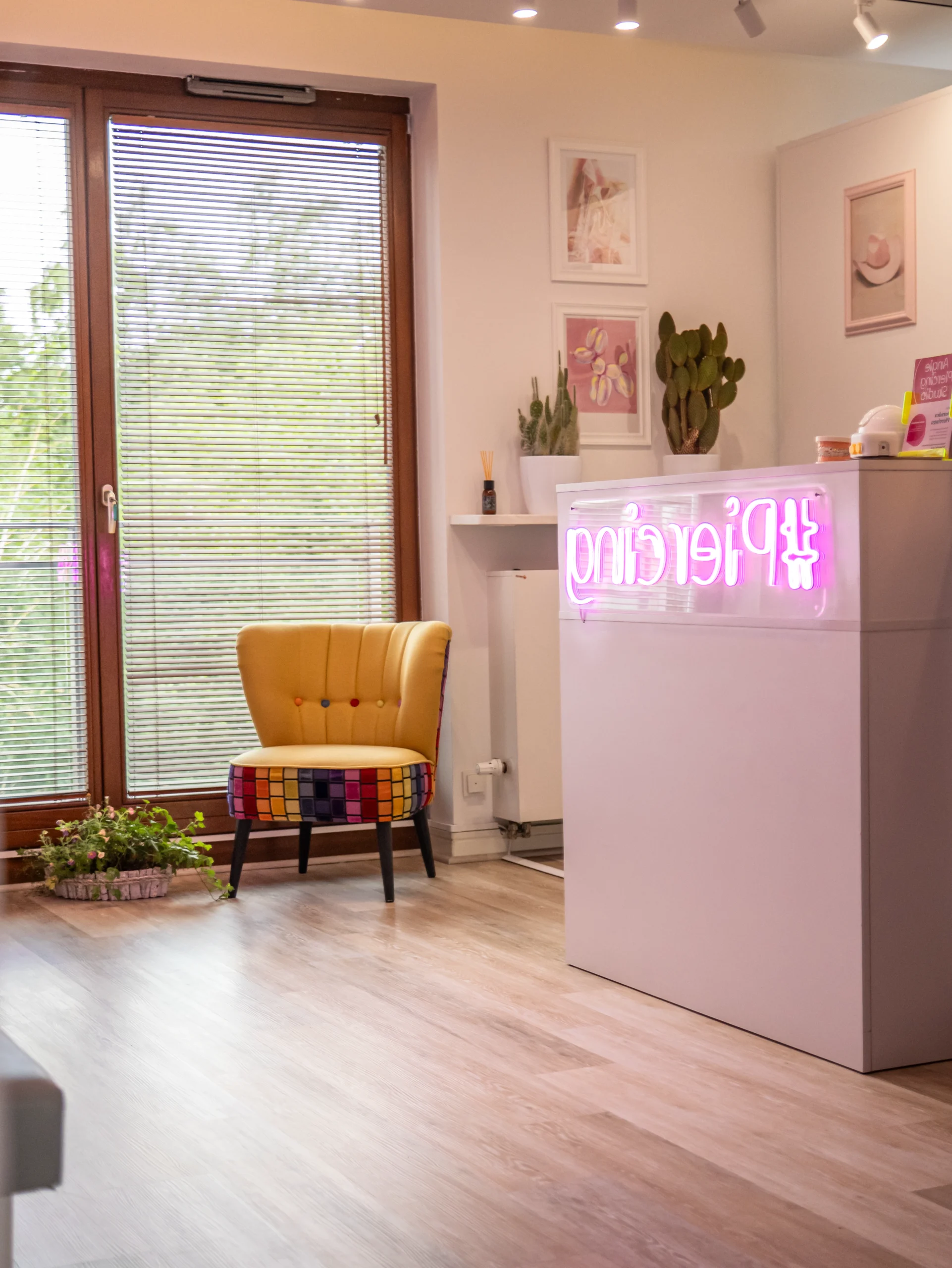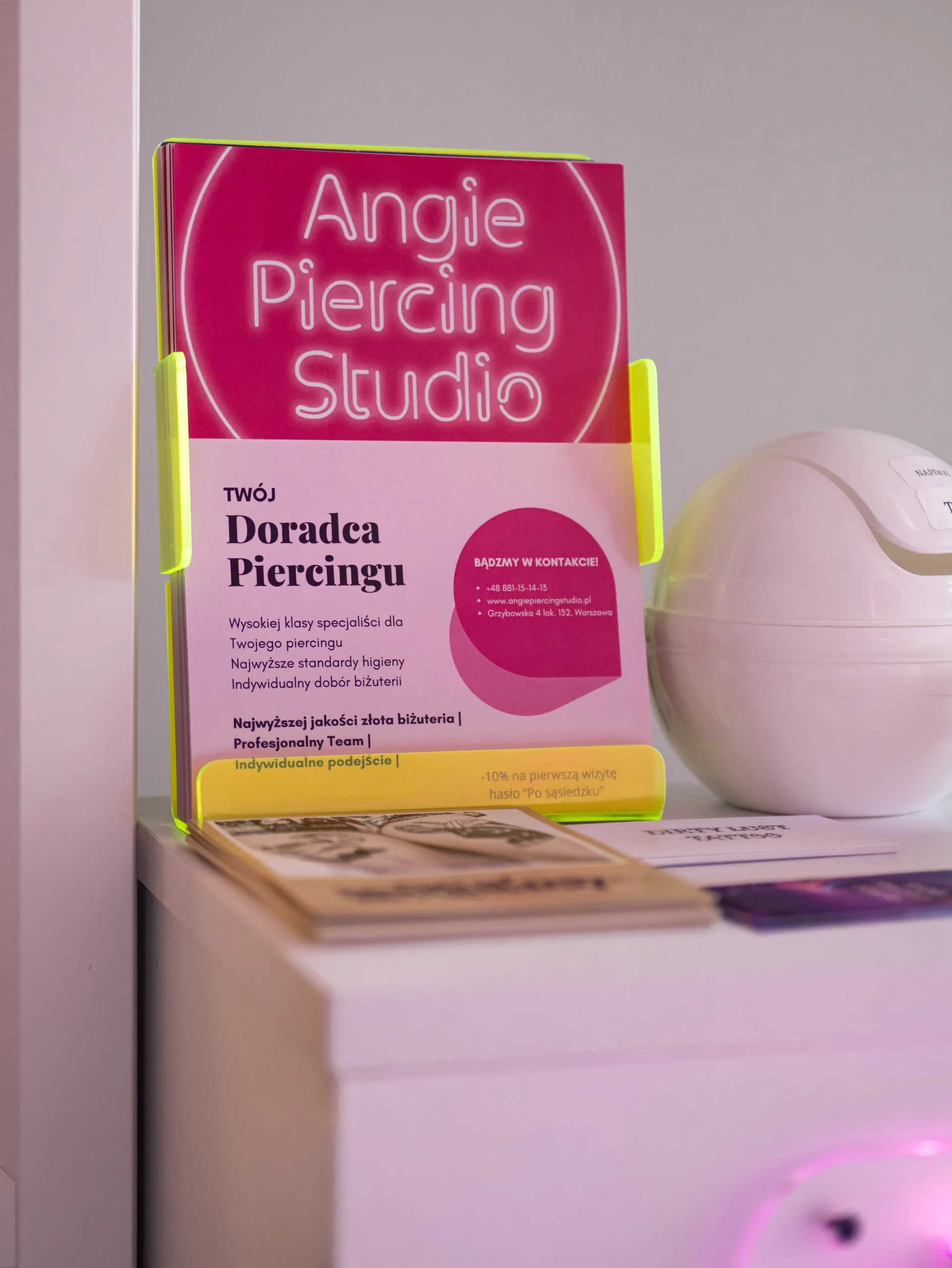 Zobacz galerię naszego studia w Angie Piercing Studio w Warszawie – przestronne, nowoczesne wnętrze, wyjątkowa atmosfera i dbałość o każdy detal. Przytulne wnętrze, dużo różu, neony, i wszystko, co potrzebne żebyście czuli się komfortowo, swojo i bezpiecznie.